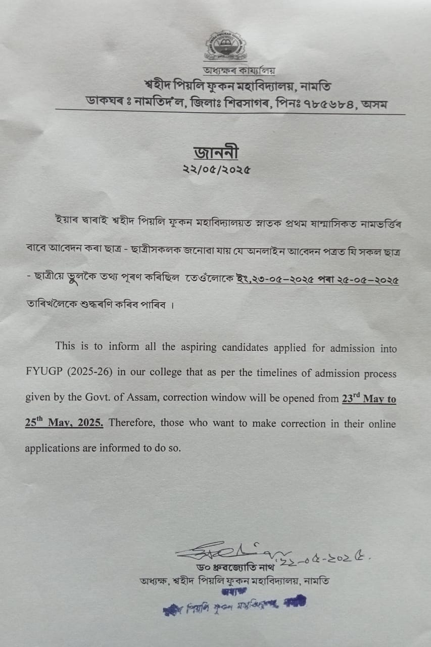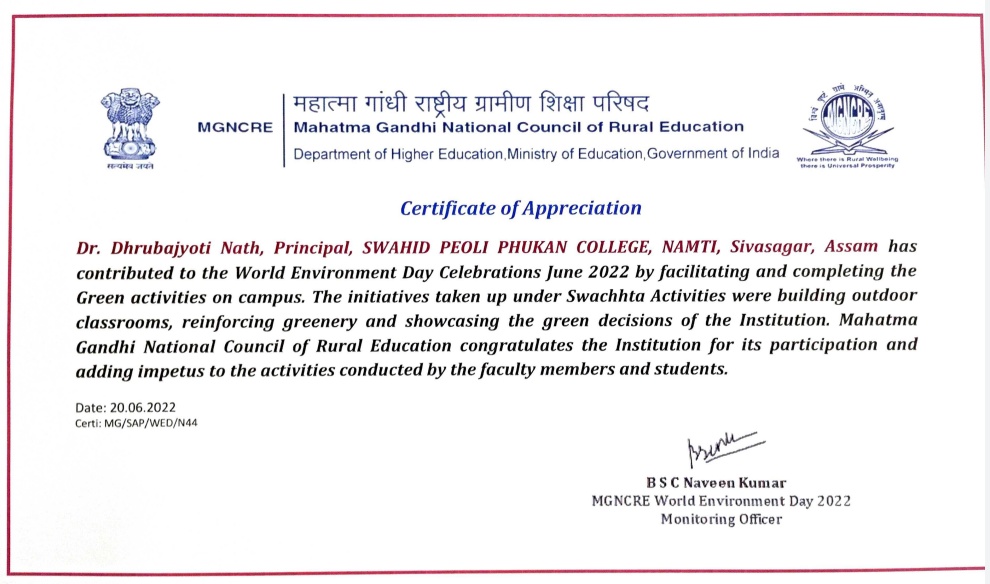Swahid Peoli Phukan College, Namti emerged as the milestone in the field of higher education in greater Namti under the auspices of the founder Principal Sri Durgadhar Bora and a group of visionary persons in 1970. The College has a history of forty-nine (49) years of dedicated service towards creating awareness in the neighbourhood and developing infrastructure and facilities for imparting education in this historic region.